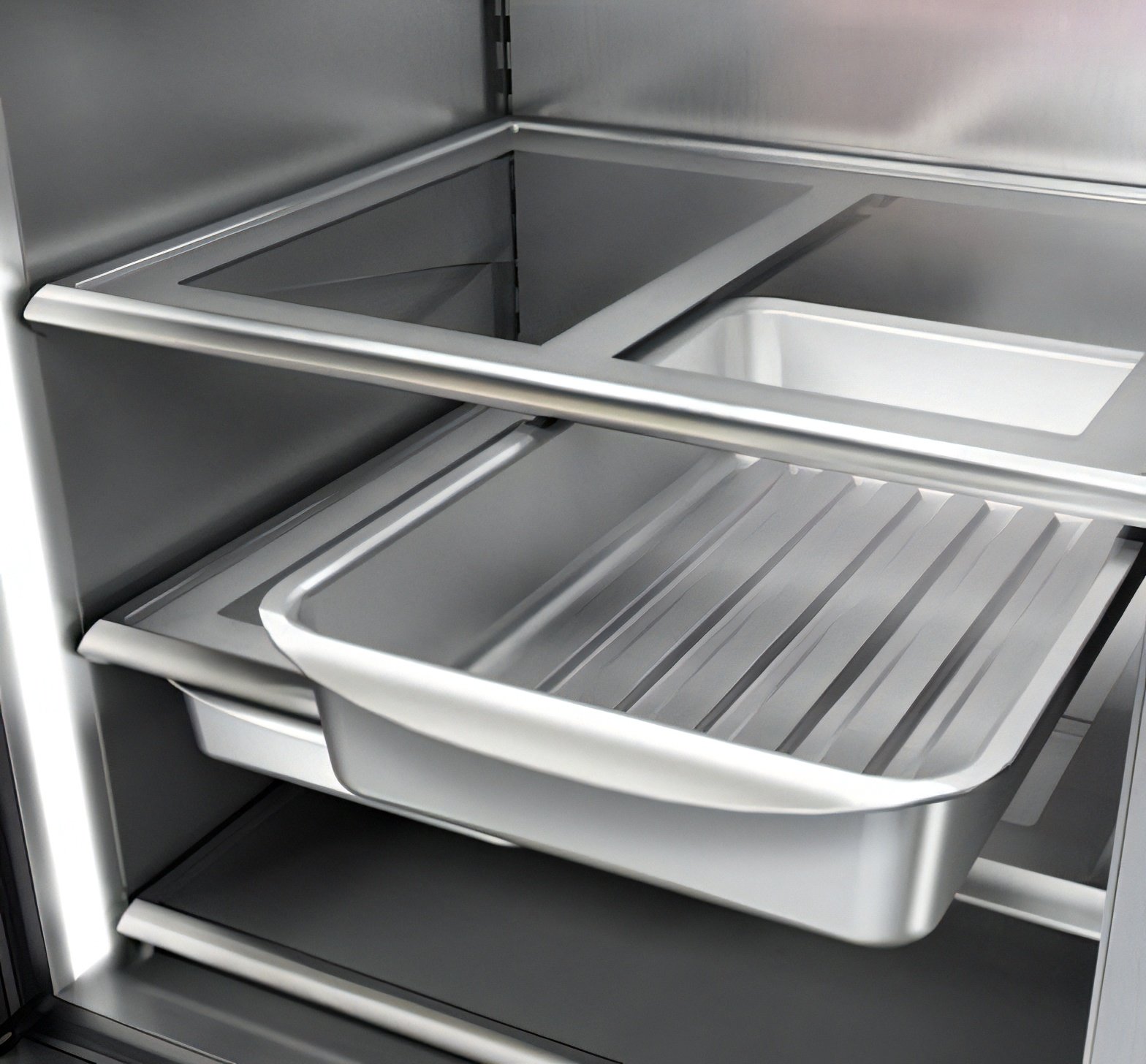 Flexible Utility Bins: Two stainless steel bins nest below the refrigerator shelving to reclaim often-wasted vertical space. With six potential docking positions and an oven-safe build, these bins transition effortlessly from marinating in the fridge to roasting in the oven. Or serve to store small items high above the items stored on the shelf below.